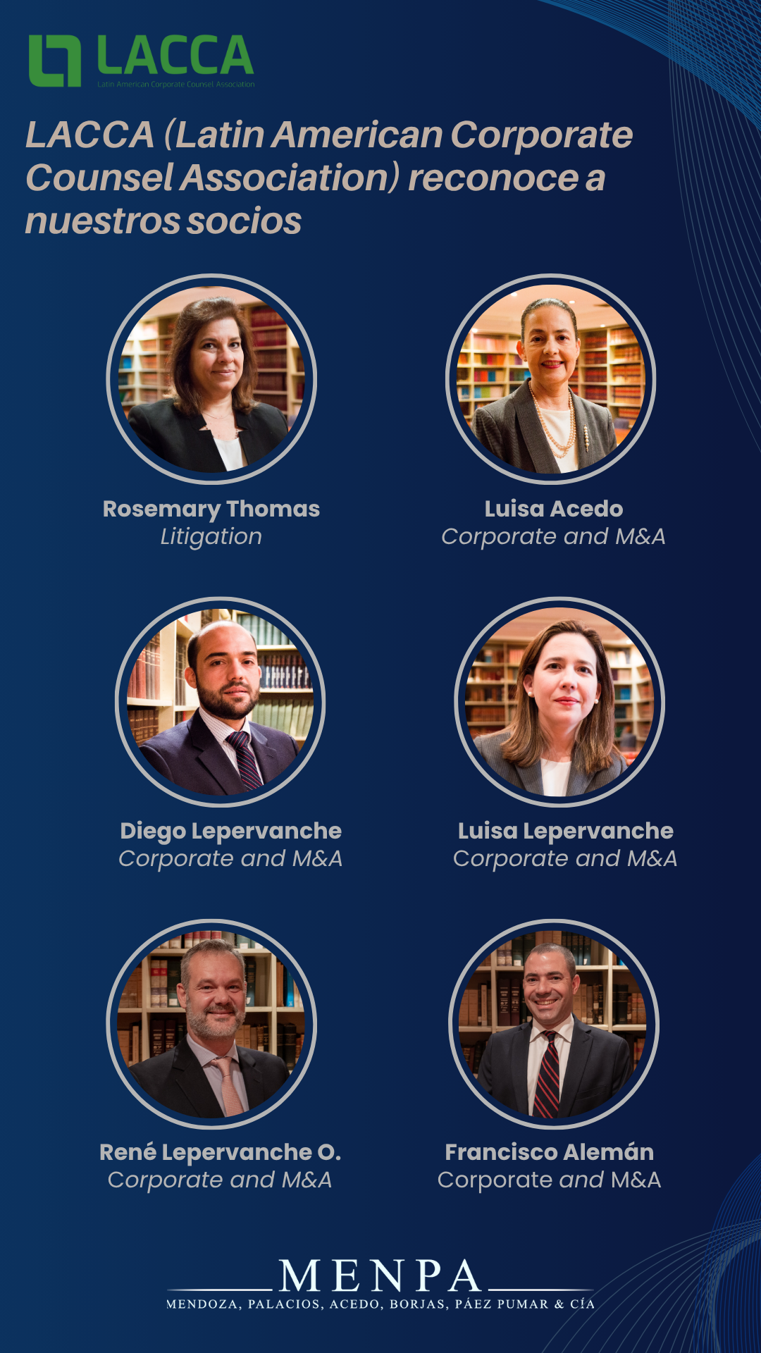 Our partners are recognized by LACCA, The Latin American Corporate Counsel Association, as "LACCA Approved 2026." This is a particularly significant recognition because it is a list of the attorneys most voted for by legal counsel of the most important companies in Latin America. It is a great honor for MENPA that Rosemary Thomas has been selected in the Litigation practice, and that MENPA stands out in Corporate and M&A, with the selection of Luisa Acedo, Diego Lepervanche, Luisa Lepervanche, René Plinio Lepervanche, and Francisco Alemán. Many thanks to our clients' legal counsel for this vote of confidence.