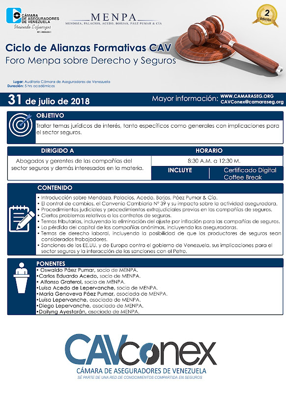 Nuestro equipo expondrá distinto temas de interés, tanto específicos del sector seguros, como generales, pero con implicaciones para dicho sector. A continuación la agenda del evento: Introducción sobre Mendoza, Palacios, Acedo, Borjas, Páez Pumar & Cía., por Oswaldo Páez Pumar. El control de cambios, el Convenio Cambiario Nº 39 y su impacto sobre la actividad aseguradora, por Diego Lepervanche. Procedimientos judiciales y procedimientos extrajudiciales previos en las compañías de seguros, por Alfonso Graterol. Ciertos problemas relativos a los contratos de seguros, por Carlos Eduardo Acedo. Temas tributarios, incluyendo la eliminación del ajuste por inflación para las compañías de seguros, por María Genoveva Páez Pumar. La pérdida del capital de las compañías anónimas, incluyendo las aseguradoras, por Luisa Acedo de Lepervanche. Temas de derecho laboral, incluyendo la posibilidad de que los productores de seguros sean considerados trabajadores,