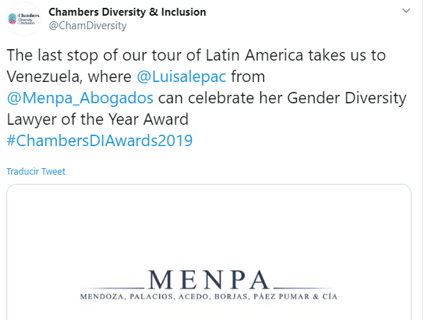 El premio reconoce a los bufetes que transforman la política y la retórica en acciones positivas, que promueven el trabajo y la cultura de la mujer en el sector jurídico. MENPA destacó como la única firma de abogados de Venezuela en alcanzar esta distinción. La firma también había sido nominada en la categoría Work-Life Balance: Latin America; y nuestra socia, Luisa Acedo en el área Corporate Governance".