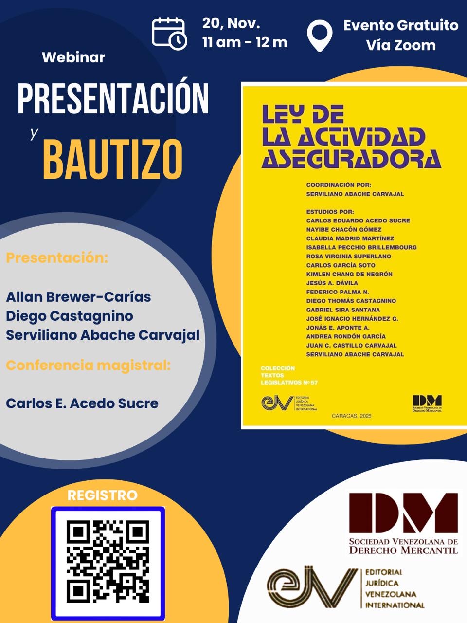 Nos complace anunciar la presentación del libro “Ley de la Actividad Aseguradora”, coordinado por Serviliano Abache Carvajal y editado por la Editorial Jurídica Venezolana, con el auspicio de la Sociedad Venezolana de Derecho Mercantil. Esta obra, que analiza distintos aspectos de la reforma de la Ley de la Actividad Aseguradora, publicada en Gaceta Oficial No. 6.770 Extraordinario del 29 de noviembre de 2023, incorpora los estudios de nuestros socios Carlos Eduardo Acedo Sucre (“Problemas solucionados por la reforma hecha en el año 2023 a la Ley de la Actividad Aseguradora, problemas pendientes de solucionar y problemas nuevos creados por esta reforma y por las providencias administrativas de SUDEASEG publicadas el 3 de septiembre de 2024”) y Juan C. Castillo Carvajal (“Comentarios sobre los aspectos tributarios de la Reforma de la Ley de la Actividad Aseguradora”), así como los de otros reconocidos juristas venezolanos. Durante la presentación, nuestro socio Carlos Eduardo Acedo Sucre hará la conferencia magistral. La información del evento es la siguiente: Fecha: 20 de noviembre de 2025. Hora: 11:00 am – 12:00 pm (hora Venezuela). Modalidad: Zoom. https://us06web.zoom.us/meeting/register/hApuMJJSTimfw-1vU0qFRA
